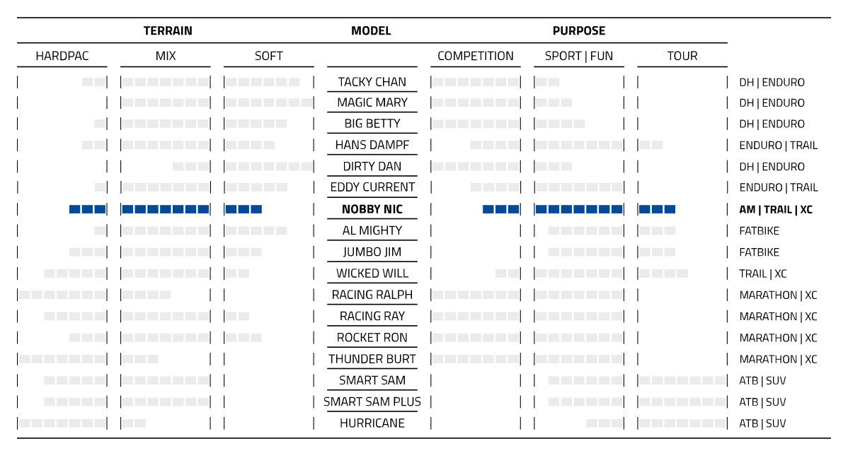 Le pneu VTT avec la plus large palette d’applications. La polyvalence en toutes situations, peu importe la météo ou le terrain. Champs d’utilisation le plus large possible : du XC aux pistes d’Enduro techniquement difficiles en passant par le Tour et le All Montain.